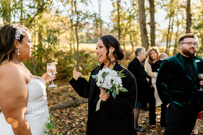 Dominique and Edward chose emerald green for their main wedding color and accented it with black and white. The groom wore a emerald green velvet suit and grooms people all wore black while the bridesmaids wore all different dresses in black as well. The neutral tones worked well together for their beautiful late fall wedding.