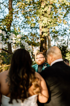 The Woodlands at The Stone Mill Inn were the perfect setting for their Twilight inspired wedding ceremony. The surrounding trees were full of varying shades of greens, and their wedding colors popped on the neutral background setting.